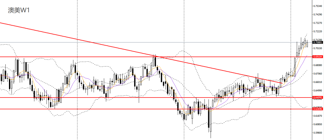 澳美连续多周收涨,RSI接近超买区,波段预计将延续升势。周五收十字小阳线,继续围绕5日、10日均线震荡,4小时仍处于0.71-0.7140区间震荡格局,稳健者可暂时观望。