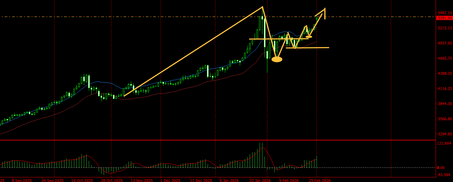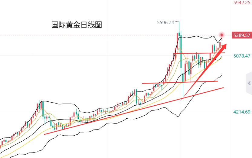 从之后的走势看,上周五亚盘开盘后,黄金回落5166美元企稳,反弹5200美元遇阻,走势保持高位横盘震荡,直到美盘开盘后,黄金突破5200美元整数关口继续上涨,到收盘时刷新日高至5280美元;本周一开盘,黄金直接站上5300美元整数关口,跳空高开近100美元,在快速回落5304美元企稳后,涨至5393美元遇阻,回落5303美元企稳后,黄金继续冲高,涨至5419美元遇阻,目前交投于5385美元附近。总体来看,黄金高位震荡之后再次冲高,走势与我们的看涨方向一致。