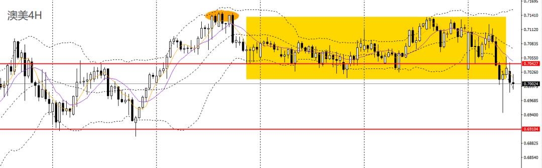 澳美昨日大幅走低,4小时跌破0.70-0.7140震荡区间下沿,短线趋势转弱,如于0.70关口附近遇阻可进空,后市预计将下探0.6960一线。