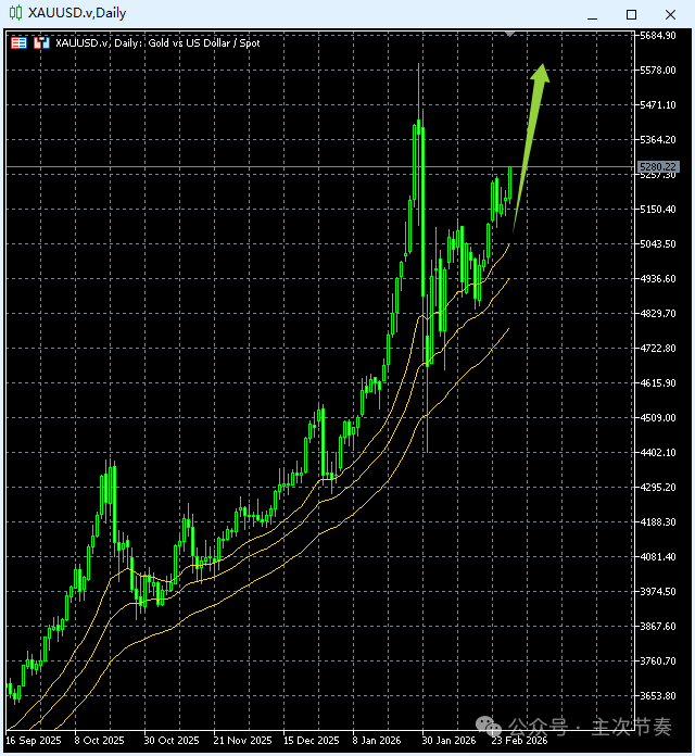 Inception: 2026-1-25黄金已经摆脱1月初出现过的局部动能交替,特别是上周的大阳线,一举向上脱离了原高位阻力区,那么5000整数关口也就只是个心理感知位,阻力效果很可能微乎其微。预期近日很容易向上突破5000进入“5”时代。update: 2026-2-1一周之内,黄金进入了“5”时代,又重回了“4”时代。周k线图收出来的阴线+长上影线,就比月线图体现出的压力大一些了。但毕竟长线大涨势依然保持完好无忧,均线系统依然是平行的多头排列方式。所以对于周线图而言,压力依然是局部性质。引起的节奏变化应该还只是高位震荡反复性加强的范畴。update: 2026-3-1高位宽幅震荡的基础已经形成,区间有了、初步的动能大交替有了。常规来说,接下来的发展是高位反复交替几次,重新积蓄动能,再向上突破积蓄拉升。这是最健康的发展节奏。当然,需要同时考虑到的是:现在的国际局势太过动荡,最近几年已经多次给黄金提供直接拉升的动力,也出现过好几次回调不充分就强势突破的情况。现在同样面临这样的情况。所以,多头思路不变的前提下,用常规节奏(如图)作为基础判断,再兼顾考虑极端强势的发生。黄金日线图(中线