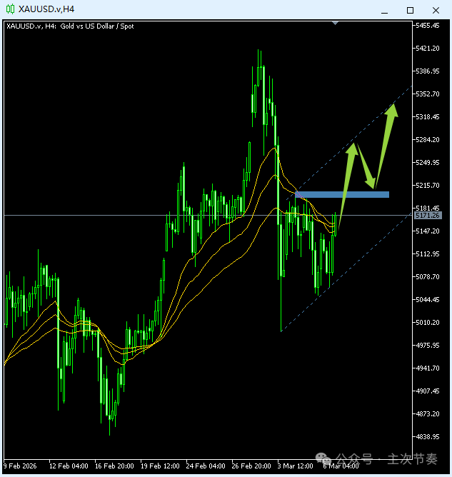 Inception: 2026-3-8中东局势在上周给黄金多头提供的推动有限。真正从中受益更多的是美元,美元兑大部分品种全面上涨,但黄金也并没有转跌,强势基调仍在。2月2日以来,黄金的向上回升过程,一直是宽幅震荡上行节奏(这个可以自行在8小时图查看,内部节奏更清晰),当前还是在这个节奏范围内运行。本周,预计黄金依然是宽幅震荡上沿的节奏,先运行向图中通道上沿5280附近,然后在反复中向前期高点挺进。使用说明: