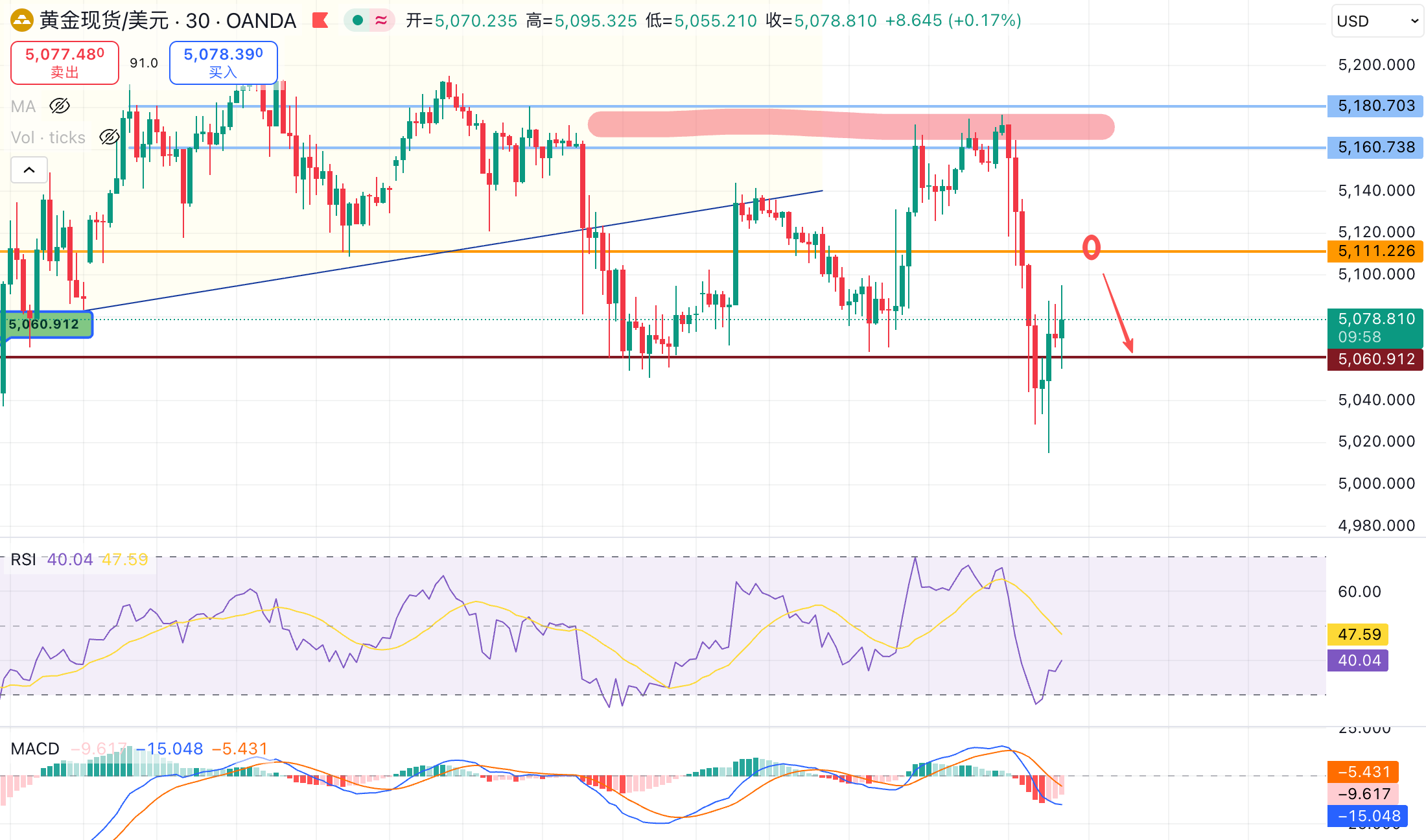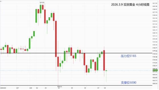 今天黄金走势颇为特殊,原油暴涨之际黄金跳空高开至5192,随后快速暴跌至5014,跌破上周五非农起涨点与3月5号低点,创下3月以来新低。结合原油暴涨、美元走强的基本面,从黄金这波快速下跌来看,短线黄金大概率下探4950~4850区间,当前黄金价格在5095。