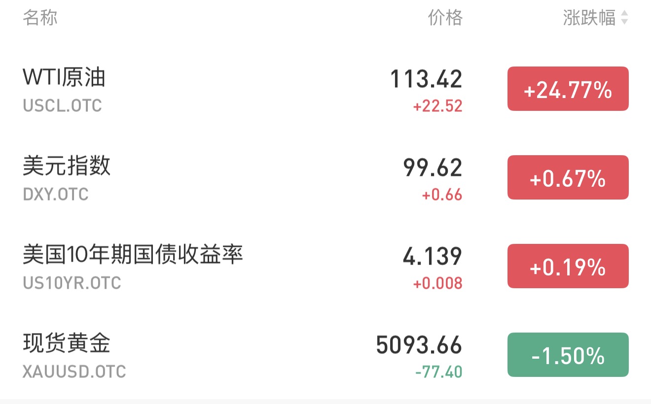 今天是3月9号,星期一,今天行情迎来重磅大新闻。首先是美原油,开盘暴涨25%,当前美原油报价在115附近。原油上涨会影响诸多方面,最直接的就是推高全球通货膨胀,包括美国的通胀水平。