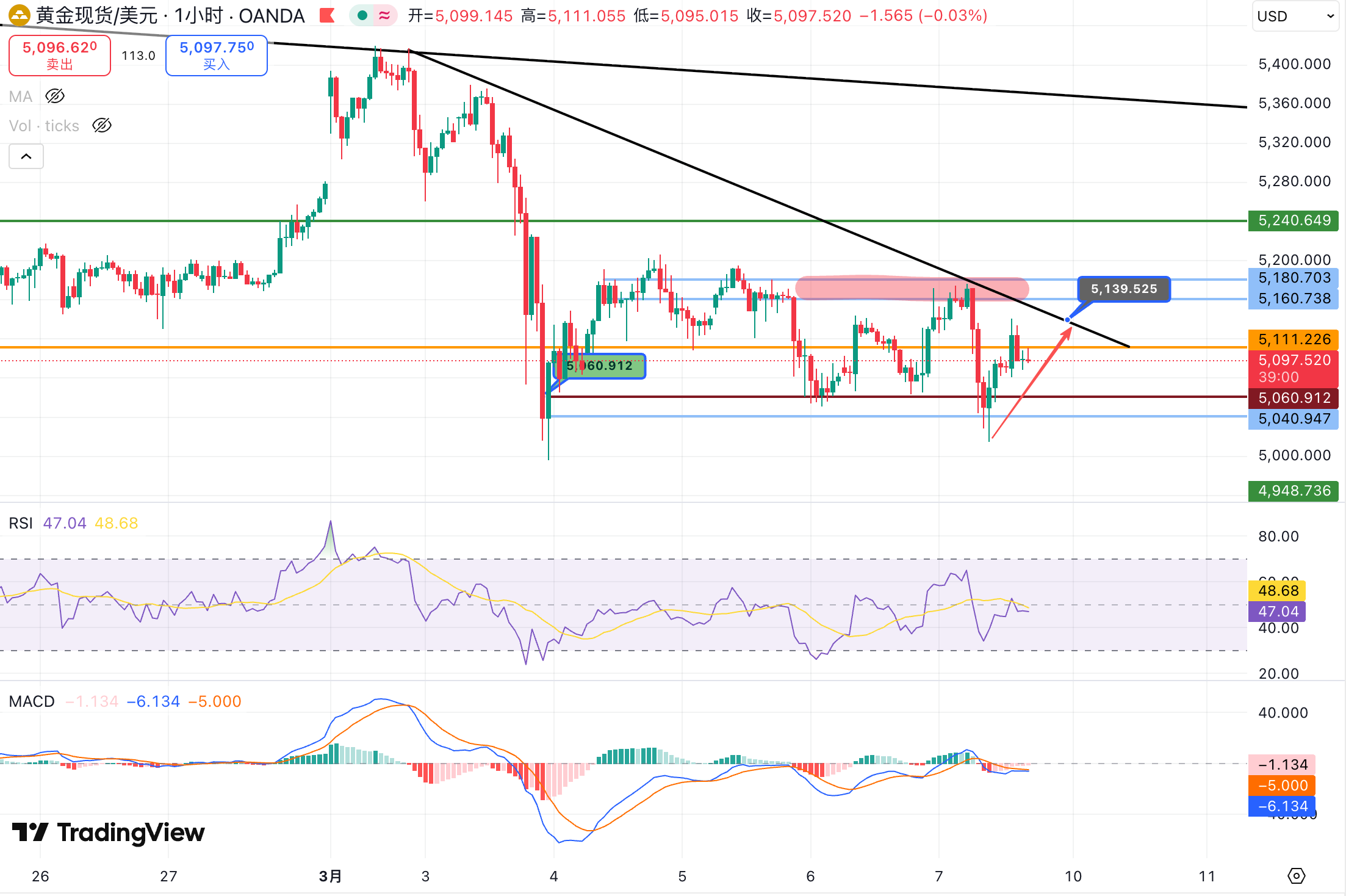 上周五我们认为,由于美伊爆发军事冲突,导致国际油价持续飙升,加剧全球通胀压力,这可能迫使美联储在更长时间里维持高利率,甚至再次加息,对黄金价格造成压力,短期技术面也显示黄金反弹遇阻后,存在继续调整的需求,因此操作上建议大家,上方压力关注5143美元,其次5200美元,下方支撑关注5050美元,其次5000美元。
