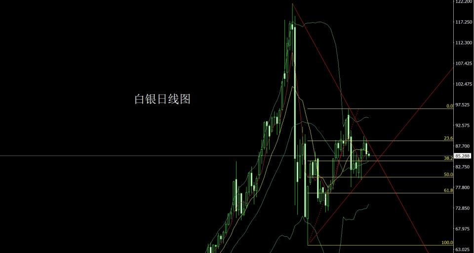 白银市场昨日开盘在88.26的位置后行情先拉升,日线最高触及到了89.43的位置后行情冲高回落,日线最低给到了84.375的位置后尾盘整理,日线最终收线在了85.74的位置后,日线以一根下影线稍长于上影线的大阴线收线,而这样的形态收尾后,日线阴包阳,今日的行情技术承压,点位上,早盘先回落84.1多止损83.9,目标看84.5和84.7和85-85.3