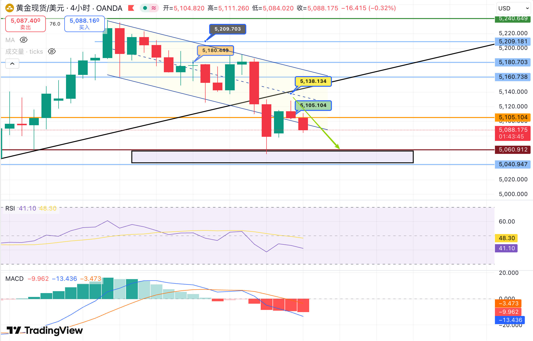今日黄金市场的焦点依然集中在 5105–5122美元 的关键阻力区间。亚欧盘期间,金价一度冲高至 5128美元,但随后快速回落,目前在 5090美元附近 震荡整理,显示上方抛压依然明显。