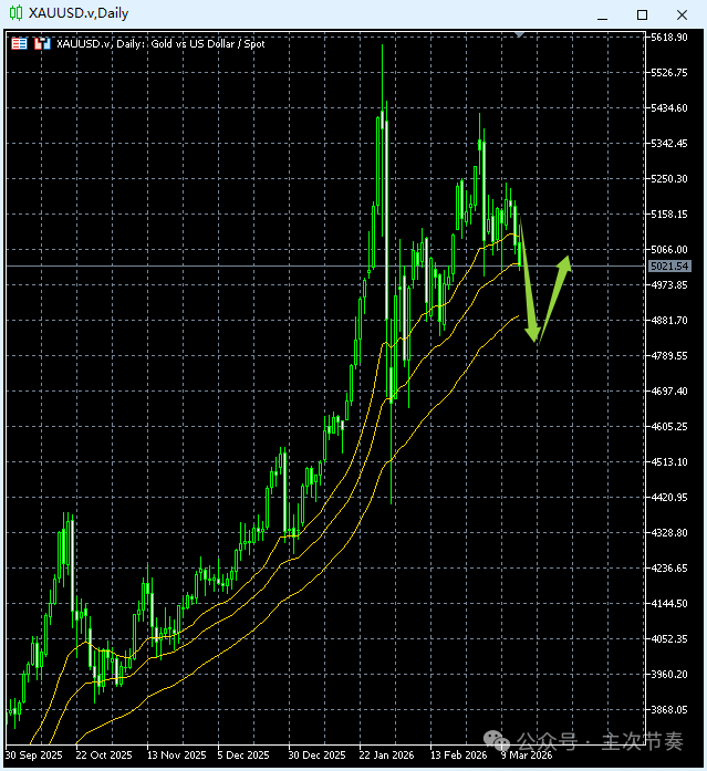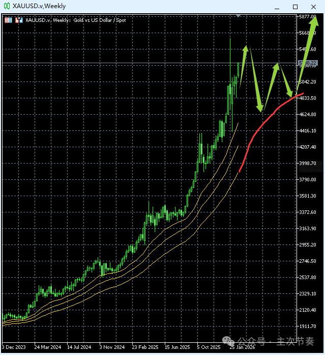 Inception: 2026-1-25黄金已经摆脱1月初出现过的局部动能交替,特别是上周的大阳线,一举向上脱离了原高位阻力区,那么5000整数关口也就只是个心理感知位,阻力效果很可能微乎其微。预期近日很容易向上突破5000进入“5”时代。update: 2026-2-1一周之内,黄金进入了“5”时代,又重回了“4”时代。周k线图收出来的阴线+长上影线,就比月线图体现出的压力大一些了。但毕竟长线大涨势依然保持完好无忧,均线系统依然是平行的多头排列方式。所以对于周线图而言,压力依然是局部性质。引起的节奏变化应该还只是高位震荡反复性加强的范畴。update: 2026-3-1高位宽幅震荡的基础已经形成,区间有了、初步的动能大交替有了。常规来说,接下来的发展是高位反复交替几次,重新积蓄动能,再向上突破积蓄拉升。这是最健康的发展节奏。当然,需要同时考虑到的是:现在的国际局势太过动荡,最近几年已经多次给黄金提供直接拉升的动力,也出现过好几次回调不充分就强势突破的情况。现在同样面临这样的情况。所以,多头思路不变的前提下,用常规节奏(如图)作为基础判断,再兼顾考虑极端强势的发生。黄金日线图(中线)