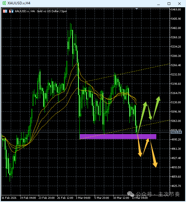Inception: 2026-3-15最近一周多时间,黄金都规范地运行在上图中的低斜率反弹通道内。截止上周五收盘,已经向下跌破通道下沿,这对空方的发展更有利。但目前刚好来到水平区间支撑区域(上图阴影区域)4996-5015,这是一道很强的关键支撑,可以看作本周走势的多空分水岭。所以上图中用两种颜色的箭头来表达了本周的节奏发展:关键看是否跌破,这需要市场在本周初走势实际验证。无论是哪个选项,都会带有几天的连续性。使用说明: