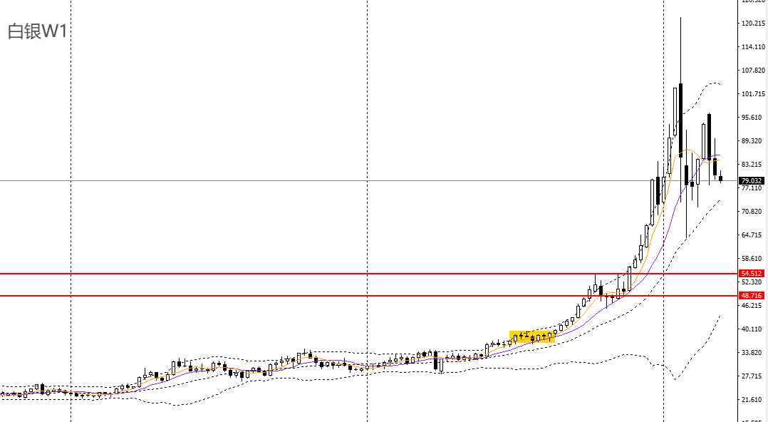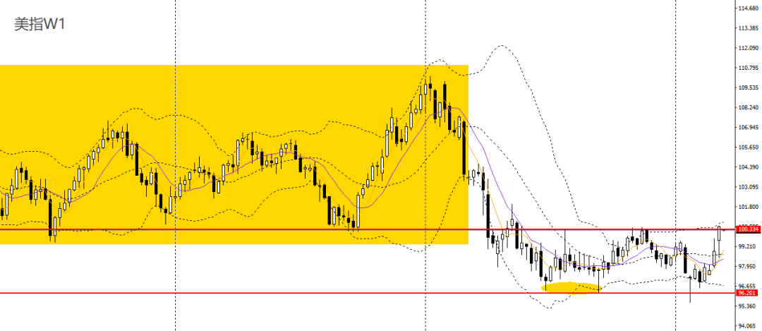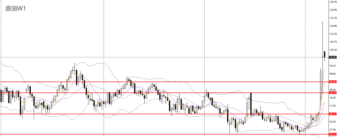 美原油上周收十字星,仍立于周线布林上轨之上,波段有望延续强劲走势。周五延续走高,日线RSI仍位于超买区,4小时刺破100关口,短线走势强劲,多单仍可持有,后市可继续看多至104附近。