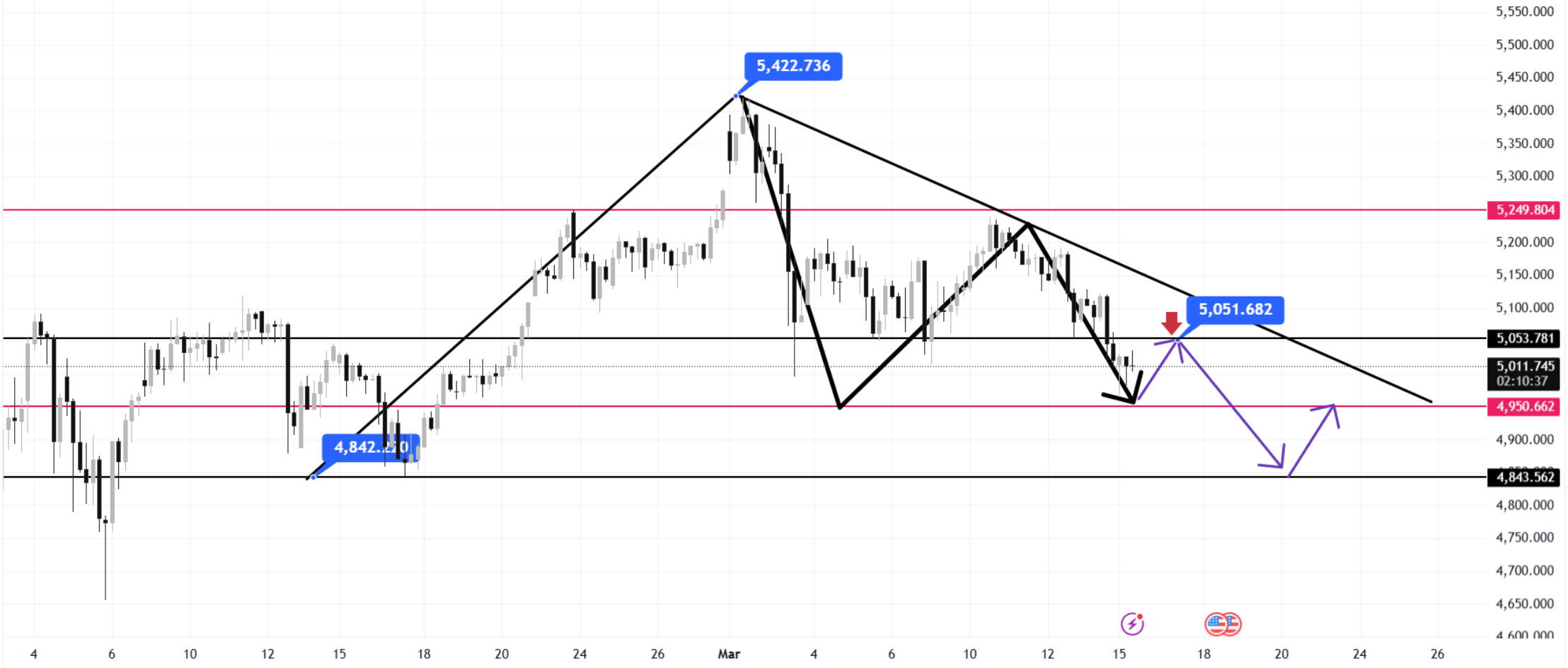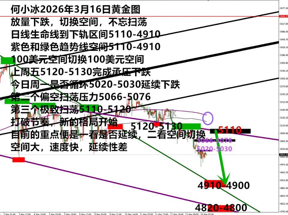 从小时级盘面上来看,5062这里可作为前半周的阻力位来参考,在没有站稳此位置之前先按照3浪的下行对待,短线上关注亚盘上探5036的高点位置压制情况;下方支撑关注早间下探的4967这里,其次是4923附近。