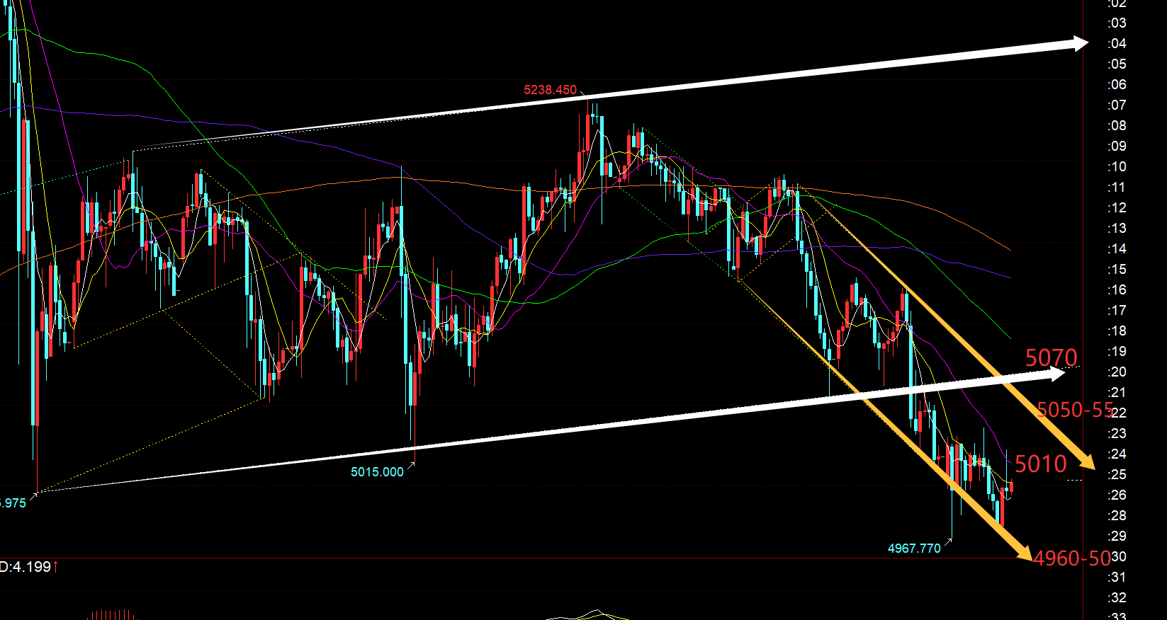 中东局势持续紧张,但是市场都预期乐观,认为这个情况不会持续多久,原油的反复表现也是印证了这一点,日内原油早盘高开之后走出一波回踩,日内二次上攻100大关之后也是大幅杀跌,基本符合我们预期的反复走势,但是点位上有些偏差,还是高估了原油的幅度,跟黄金比起来还是差了点意思,黄金的话算是预期之中的走势,早盘杀跌之后迅速回升,欧盘二次探底触及4970附近,我们跟大家分享的5000下方分批接多思路目前继续持仓等待市场验证即可,短线的话关注50500/60压力突破情况,关注4980/90附近支撑可以继续接多,操作上保持回踩低多思路,坚定看涨,并且控制仓位抄底即可