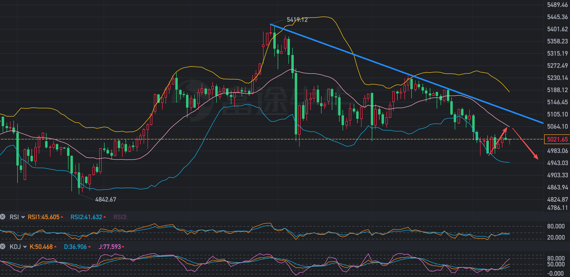 昨日黄金上冲下洗,逼近5000美元/盎司关口,短期仍有多次测试疑虑,若成功下破,需小心短线大跌可能。笔者认为,油价持续保持高位,各国央行无法宽松,澳洲央行已连续第二次升息,预期周三美联储利率决议按兵不动,但点阵图通胀预期将上升,相对利多美元,相对利空黄金。整体而言,短线建议投资者对于5000美元/盎司支撑力度保持保守态度,不要过度依赖其支撑,建议稳健者观望,激进者高空低多操作。