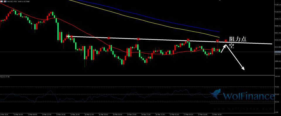 周二(3月17日)美盘初金价小范围震荡盘整,市场处于阻力线下方,触及阻力点做空观点,全球金融市场正处于地缘局势高度紧张与美联储议息会议前夕的交织影响中。受中东局势升级影响,尽管随后涨势有所放缓,但其对通胀预期的传导效应已迅速反应在美债市场。目前,基准10年期美债收益率维持在4.21%上方震荡,反映出市场在避险需求与通胀走升担忧之间的剧烈博弈。美元指数在触及100.11的高点后小幅回落至99.77附近交织,地缘风险带来的避险买盘与美债收益率的高位震荡形成了较强的支撑。与此同时,现货黄金在5000美元大关附近反复拉锯,尽管中东局势提供了坚实的避险溢价,但市场对美联储可能推迟降息的鹰派预期限制了金价的进一步突破空间。整体来看,市场正紧盯霍尔木兹海峡的通航状况及即将开始的FOMC会议,流动性在波动中保持谨慎。