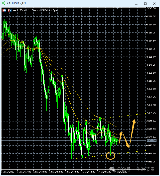 一句话看懂黄金Gold:均线精确压制,但向下刺破通道却未创新低,增加反弹变数。