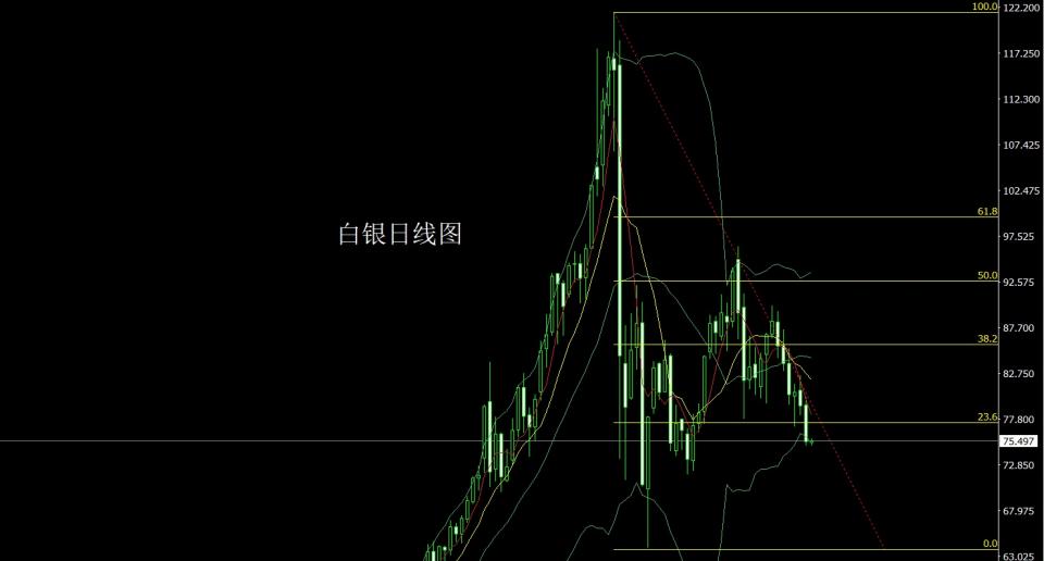 白银市场昨日开盘在79.323的位置后行情先回落给出78.092的位置后行情强势拉升,日线最高触及到了80.175的位置后行情强势回落,日线最低给到了74.961的位置后整理,日线最终收线在了75.363的位置后,日线以一根上下影线等长的大阴线收线,而这样的形态收尾后,今日的行情77.2空止损77.5,下方目标看76和75和74.8和74.5和74.2.