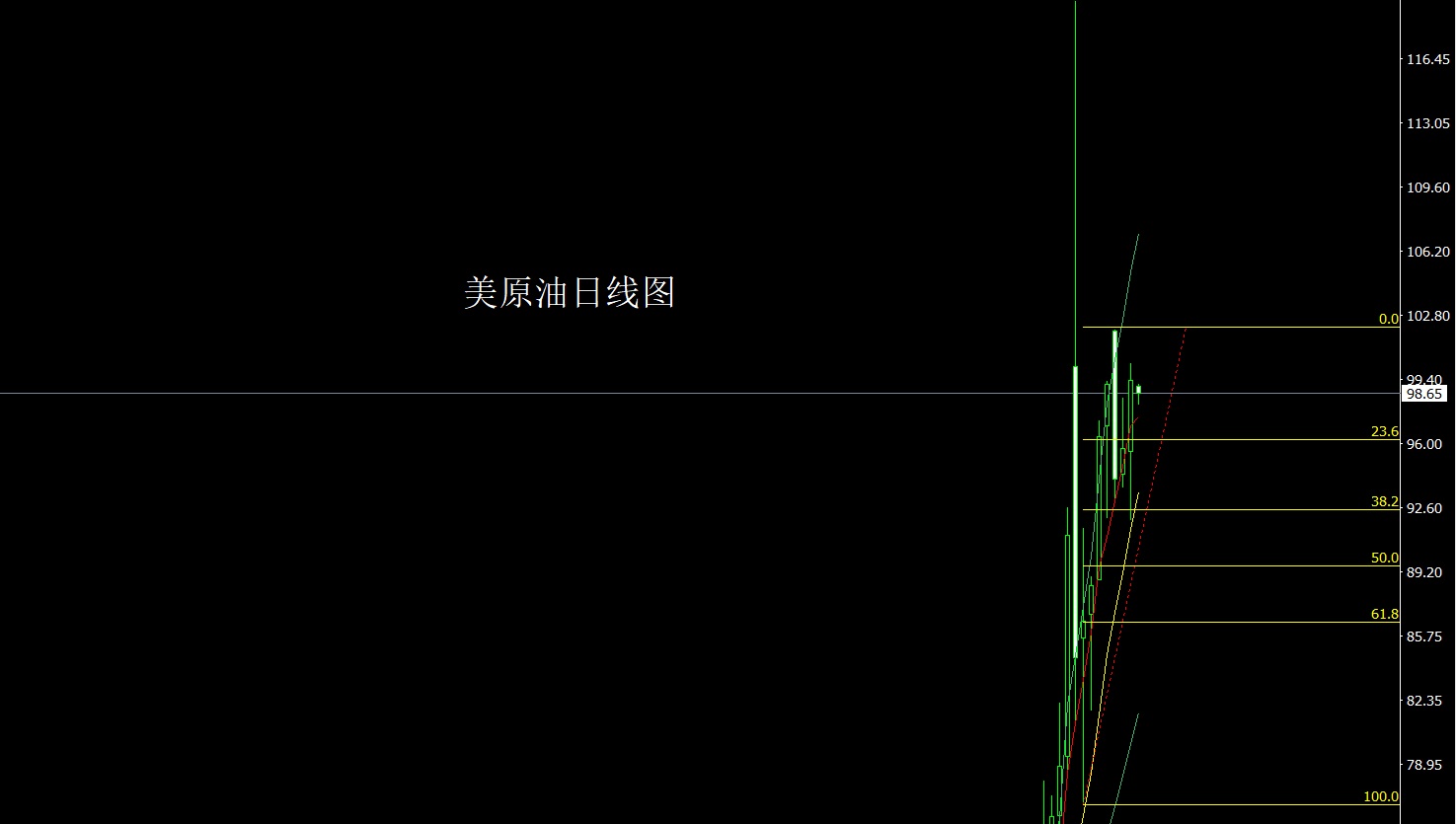 美原油市场昨日开盘在95.54的位置后行情先回落,日线最低给到了91.89的位置后行情强势拉升,日线最高触及到了100.32的位置后整理,日线最终收线在了99.31的位置后,日线以一根下影线很长的大阳线收线,而这样的形态收尾后,今日的行情回踩延续多,点位上,今日95.6多止损95,目标看98和99和100.3,破位看101和102.