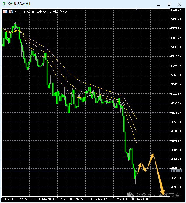 上交易日周三(3月18日):国际黄金大幅回落收跌,其伊朗威胁将袭击中东地区的多个能源设施,推动原油大幅上涨,加上美国2月PPI年率及月率大超前值,提升通胀担忧,之后美联储决议保持利率不变,鲍威尔又提及加息可能性,助力美元大涨。打压金价持续走低,并跌破60日均线支撑收线其下方,空头继续占据优势,那么在重回5000美元关口上方前,后市有望进一步下行至100日均线4600美元或扩展线支撑4545美元再次觊觎入场攀升。