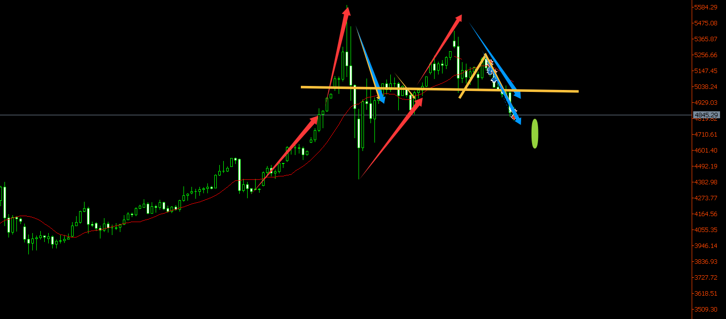 日图,金价昨日大幅回落走低,不仅打破了连续震荡的止跌筑底看涨形态,还进一步跌破60日均线支撑,空头力量加大,60日均线及之前连续的震荡的低点位置则转为阻力。后市要么重回5000美元关口之上转强等待进一步反弹,要么等待继续下探触及100日均线支撑位置看触底回升,在此之前,关注日内短周期多空交易即可。
