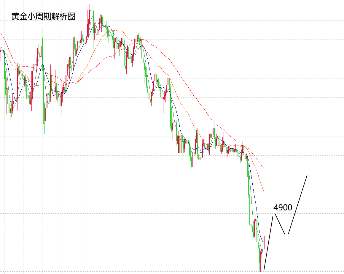 本周一直强调的4968支撑点经过四次试探已经破位,在市场的推动下,黄金出现暴跌空间,连续下跌最低在4800,这波力度是本月最大的单边走势。影响因素上面也讲到了,美元的走强,打压了黄金,但大家可以了解到,地缘局势恶化有增无减,各发冲突持续升级,黄金的避险情绪还在,所以,黄金的大趋势还是看涨,暂时没有条件出现趋势转换。不得不承认,目前黄金进入了低位震荡的极弱状态中,这波黄金要持续下跌的话,下方可能要去4650低点,因此,在没有明确确定底部状态和反转之前,黄金要继续看下跌空间。今天行情分两部分看,首先在弱势之下,黄金要持续看下跌,力度延续的话,下方逐步看4700,4650,交易尽量在弱势中反弹做空,其次,在极弱震荡中,关注上方压制点得失,日内4900强弱压制点,4975是多空延续的关键点,所以,即使现在是弱势,也要看一下反弹的力度和延续性。也就是说,今天黄金在极弱状态下,尽量以高空为主,同时看4900,4975得失,空头延续的话,下方关注4700,4650。