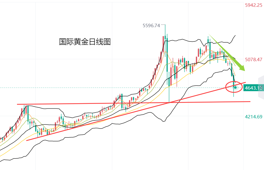 具体走势上,金价自亚市开于4831.49美元/盎司,先行反弹录得日内高点4866.95美元后,遇阻回落,持续走低,延续到美盘开盘录得日内低点4502.96美元,最后就此触底回升,最终收于4650.45美元,日振幅363.99美元,收跌181.04美元,跌幅3.75%。