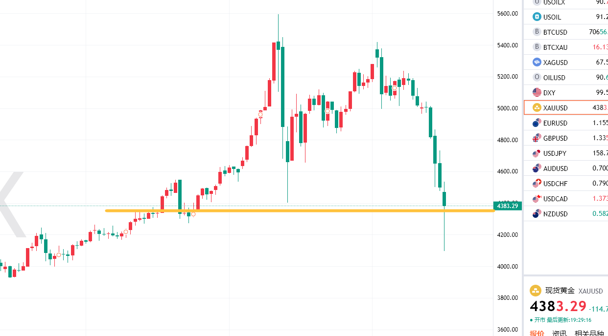 具体走势上,金价自亚市低开于4469.46美元/盎司,先行反弹录得日内高点4535.81美元,并收复缺口后,遇阻回落转跌,并持续走低,延续至亚盘尾触及日内低点4099.12美元,最终触底回升,于美盘初一度重回4500美元上方,但就此遇阻多头动力减缓,陷入震荡,最终收于4406.40美元,日振幅436.69美元,相对于上周五收盘价4503.13美元,收跌96.73美元,跌幅2.15%。