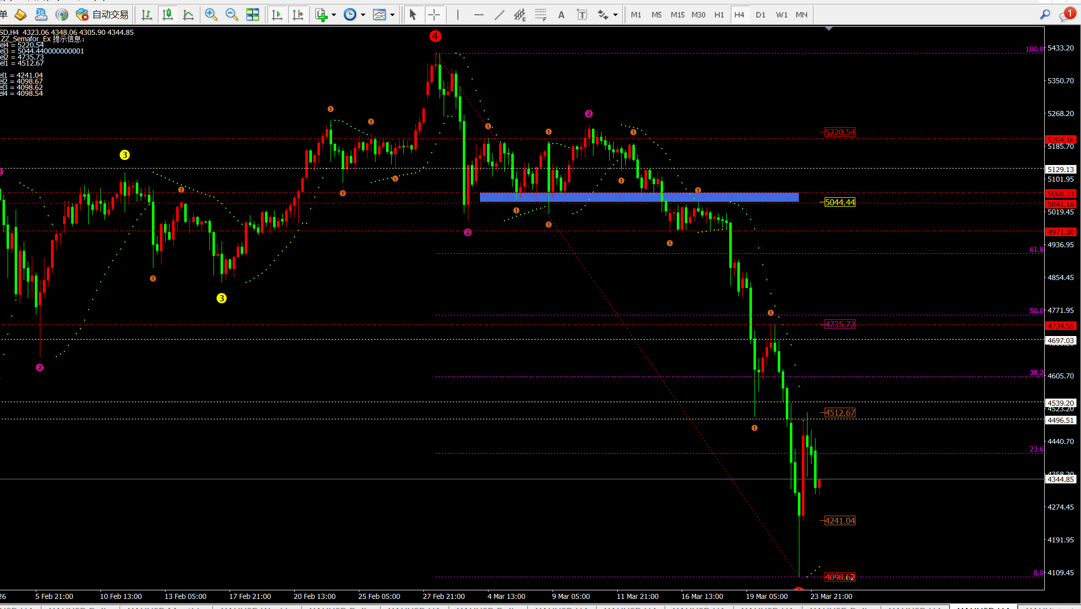 ① 昨日白盘黄金大阴柱下跌,但是在欧美盘价格收复失地再次回到4512附近;价格来回洗盘,但是昨日笔者也分析过维持在高点4500下方震荡,行情如预期走势运行。