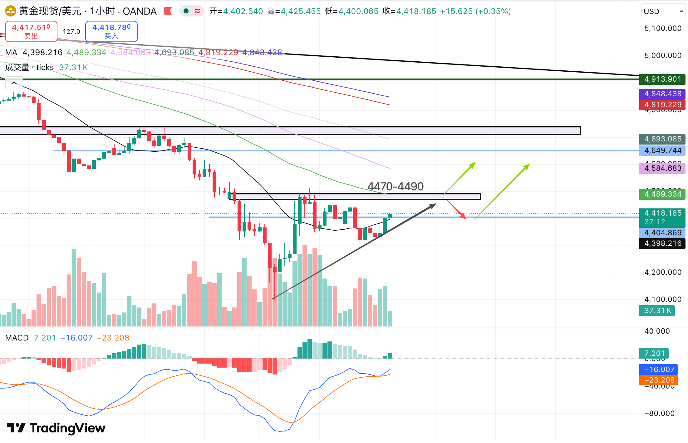昨日黄金市场延续反弹过程,早盘开盘在4406.2的位置后行情先拉升给出4448.8的位置后行情强势回落,日线最低给到了4404.3的位置后行情强势震荡拉升,日线最高触及到了4485.4的位置后整理, 日线最终收线在了4472.5 位置后,日线以也一根孕线锤头形态收线,而这样的形态收尾后,今日的行情回踩依旧多,点位上,前日4120的多止损跟进在4200昨日4310的多减仓后止损跟进在4315,今日的行情4423多止损4416,目标看4485和4510和4535和4550和4575和4600.