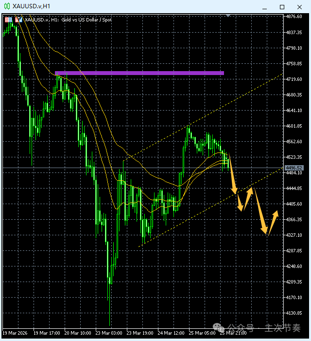 黄金在日线走势上暂时维持在低位的震荡修复中,前期的下跌走势开始放缓。目前在4小时级别走势上突破前期的4450一带的压力带之后,短期走势上关注下有没有回踩确认之后的二次上行走势,价格暂时在4570-80一带承压。4小时级别走势上短周期均线开始逐步勾头向下发散,价格慢慢承压短周期均线维持偏弱一些走势,倾向于在短期走势上可能还有一些调整的空间。小时级别走势上目前的区间压缩的比较小,关注下短线调整。