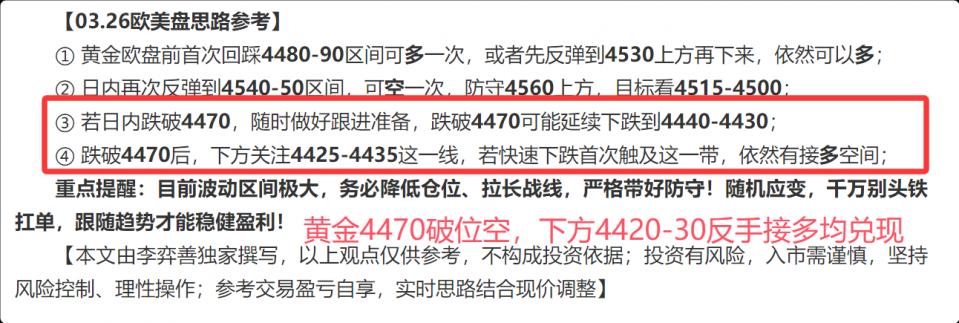 再比如今天早上给出的思路,破位4470追空看新低,也同样得到了兑现,同时金价也在4420-4430附近暂时止跌。目前的行情,大家一定要学会随机应变——节奏太快了,有的时候前一分钟还在做多,下一分钟可能就要及时跟进空单,千万别头铁,跟着行情走就好!