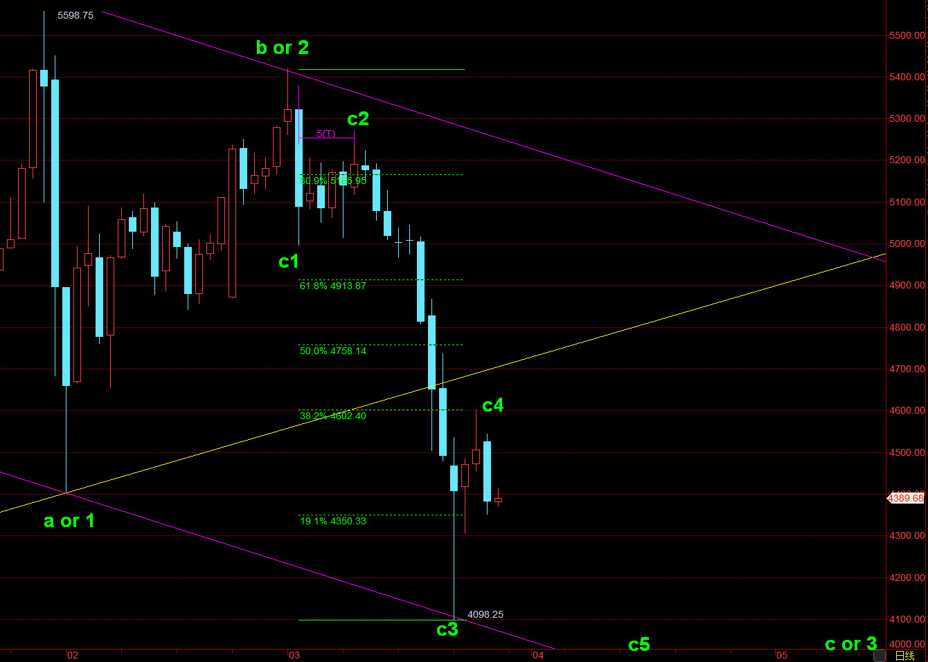 上周我们看黄金白银C3浪大跌,上周跌的比较厉害,截止本周一黄金下跌到4100美元,白银下跌到60美元关口,我们均强调开启了C4浪大反弹,由于周一反弹略大,因此,我们强调时间不够,等到黄金测试4600美元,白银测试10日均线,我们基本要开始反向开空,C4存在结束的潜能,目前而言的话,倾向于已经运行于C5浪之中了。