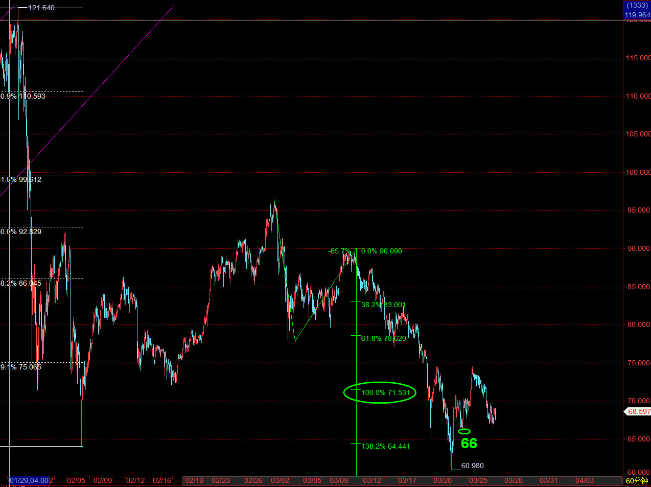 白银本周基本是60支撑看C4大反弹,之后上涨测试10日均线之后74及其上方再度翻空了。昨天文章《【格物金融】黄金白银连续反弹后,关注是否再度下探的潜能》提及下去守住66要多一次,结果昨晚66.95上涨了一次69.70美元。今天周五相对谨慎一些,66.60不破走势看反弹,上方71.5承压继续回落。