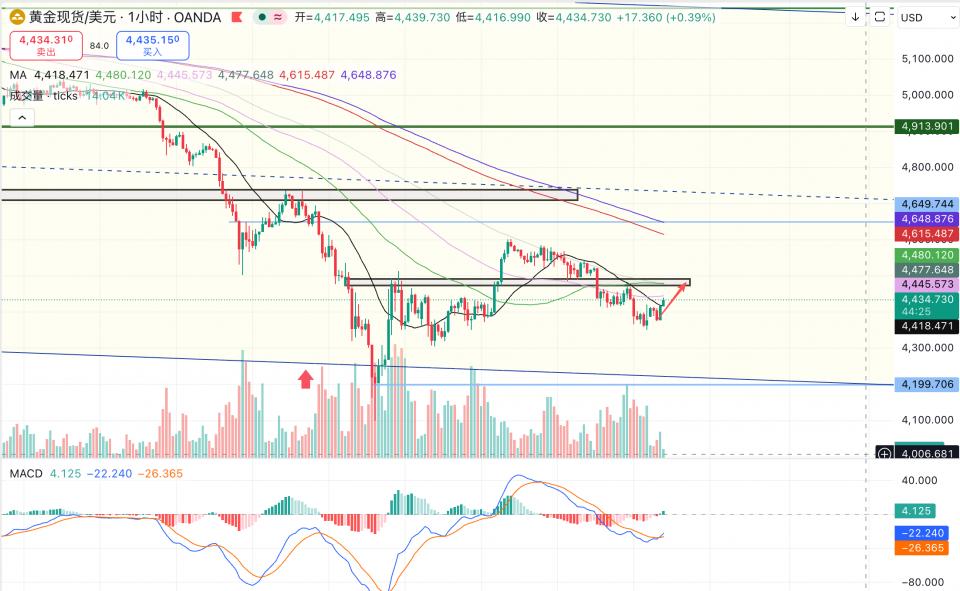 黄金1小时级别目前仍处于下跌后的震荡修复结构中,价格围绕4430一线反复拉锯。