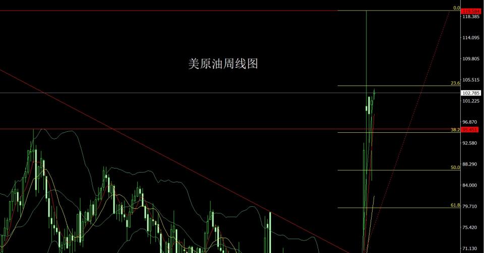 美原油市场上周高开在100.313的位置后行情先拉升给出102.175的周线高点后行情强势回落,周线最低给到了84.794的位置后行情强势震荡拉升,周线最终收线在了101.14的位置后,周线以一根下影线极长的启明星形态收线,而这样的形态收尾后,本周高开后回踩100.15多止损99.6,目标看101和102和103和104.