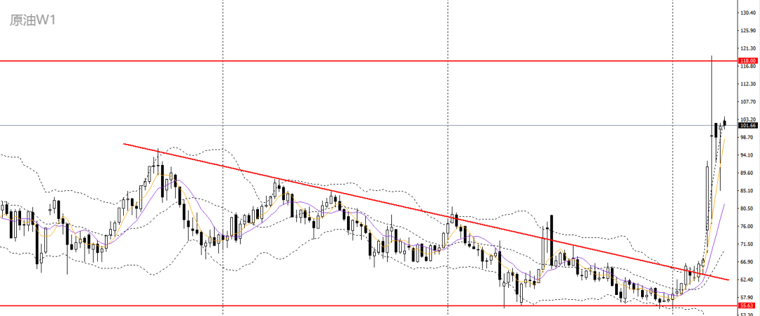 美原油上周收锤子阳线,上破周线布林上轨,波段走势仍偏强。周五强势拉涨,刷新半个月来新高,4小时触及102-104压力带,短线强势极为强劲,多单仍可持有,如进一步站上,可上看至107。