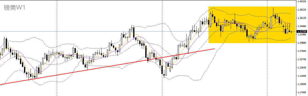 镑美上周冲高回落,承压于10周均线,RSI下破50,波段仍未摆脱此前震荡区间。日线呈三只乌鸦,下探布林下轨,4小时逼近前低,仍处于此前震荡区间,如维稳于1.32上方,空单可离场。