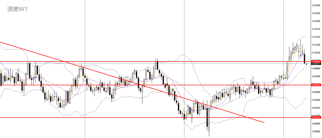 澳美上周收流星阴线,RSI跌至50左右,波段多头力量减弱。周五收十字星,徘徊于日线布林下轨附近,4小时触及0.6830-0.6840一带支撑企稳,空单可暂时离场,稳健者可保持观望。