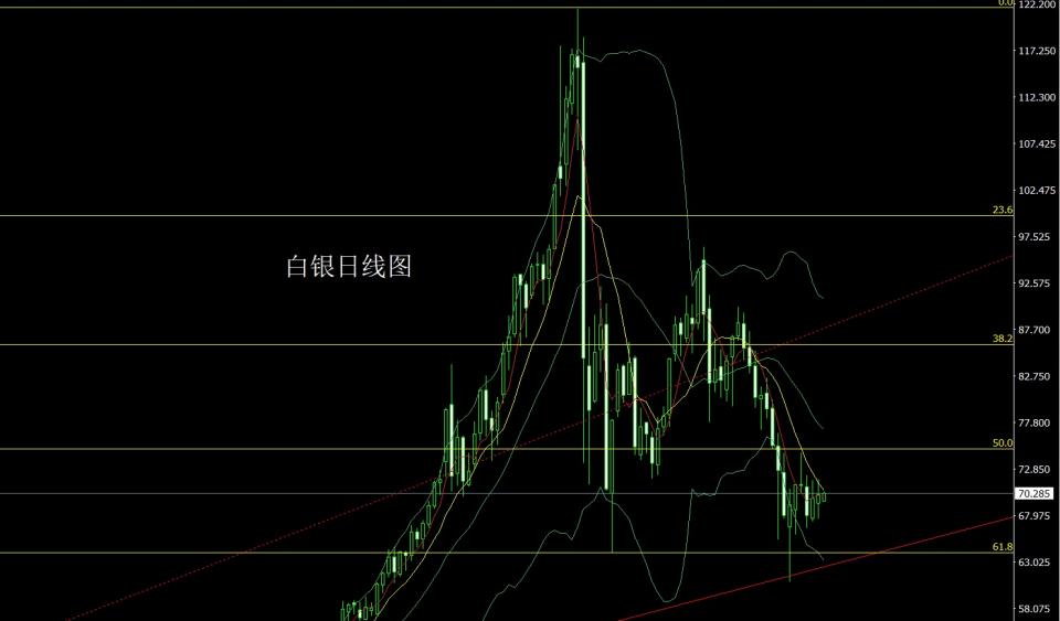 白银市场昨日开盘在69.235的位置后行情先回落,日线最低给到了67.615的位置后行情强势拉升,日线最高触及到了71.775的位置后行情承压整理,日线最终收线在了70.1的位置后行情以一根上下影线等长的纺锤形态收线,而这样的形态收尾后,今日的行情67.7多止损67.5,目标看68.5和69和70-71.