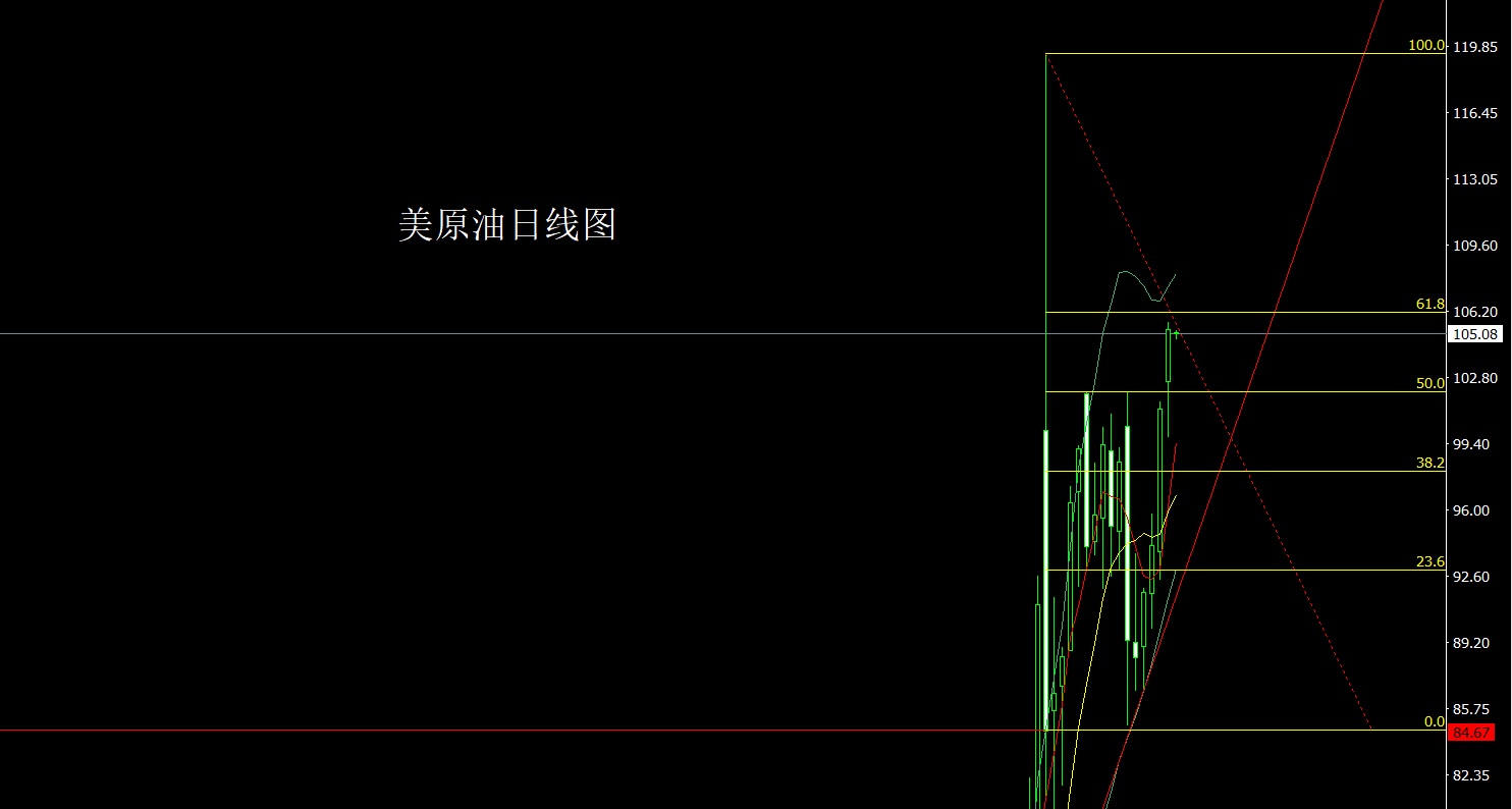 美原油市场昨日高开在102.59的位置后行情先回落,日线最低给到了99.73的位置后行情强势拉升,日线最高触及到了105.67的位置后整理,日线最终收线在了105.26的位置后日线以一根下影线极长的大阳线收线,而这样的形态收线,而这样的形态收尾后,今日的行情会依旧多,点位上,昨日100.15的多减仓后止损跟进在101,今日的行情103.5多止损103,目标看105和106和107-108.