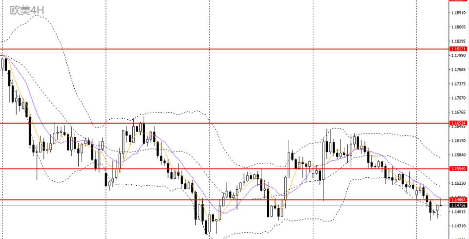 欧美连续4日阴跌,日线RSI位于50之下,4小时触及1.1440一线支撑企稳,低位谨慎做空,空单建议减仓,稳健者可暂时观望。