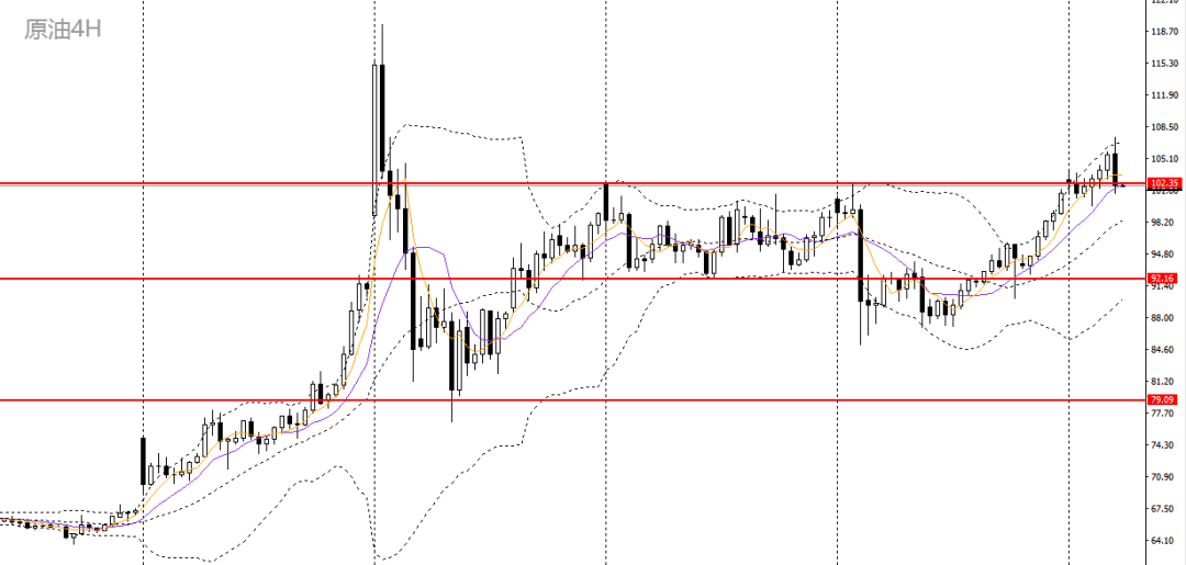 美原油周一延续涨势,立于5日均线之上,4小时一度升破102-104压力带,如于100-102附近再度企稳可进多,后市大概率将升破107,挑战110。