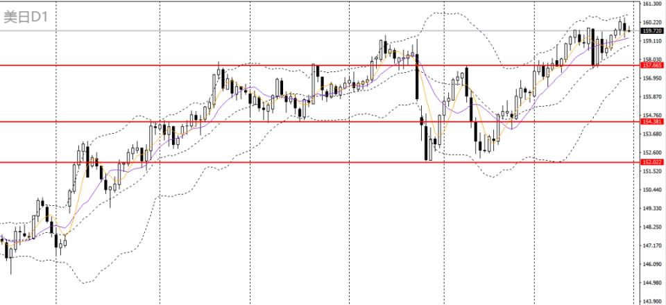 美日周一收跌,回踩5日均线,4小时未能有效站上160关口,重回此前震荡区间,如继续承压于160.40下方,多单建议离场。