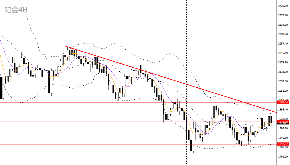 铂金昨日继续收涨,守住1800大关,4小时升破关键压力1940,且逼近下行趋势线,如进一步上破,短线可看多至2000附近。