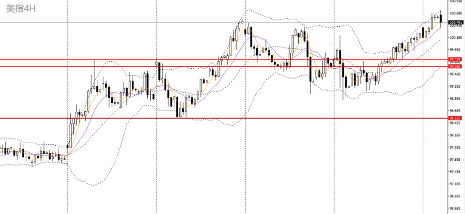 美元指数创下10个月以来新高,日线RSI到达高位,4小时升破关键压力带100.30-100.50,上行空间打开,短线有望继续上探101关口。