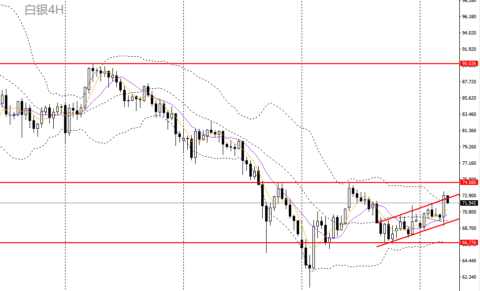 白银延续反弹,刺破10日均线,4小时处于上行通道内,多单可继续持有,如彻底站上72,可看多至74-75。