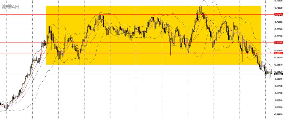 澳美收十字阴线,仍徘徊于日线布林下轨附近,4小时再度刺破0.6830-0.6840一带支撑,短线大概率将延续跌势,0.6870附近承压可进空。