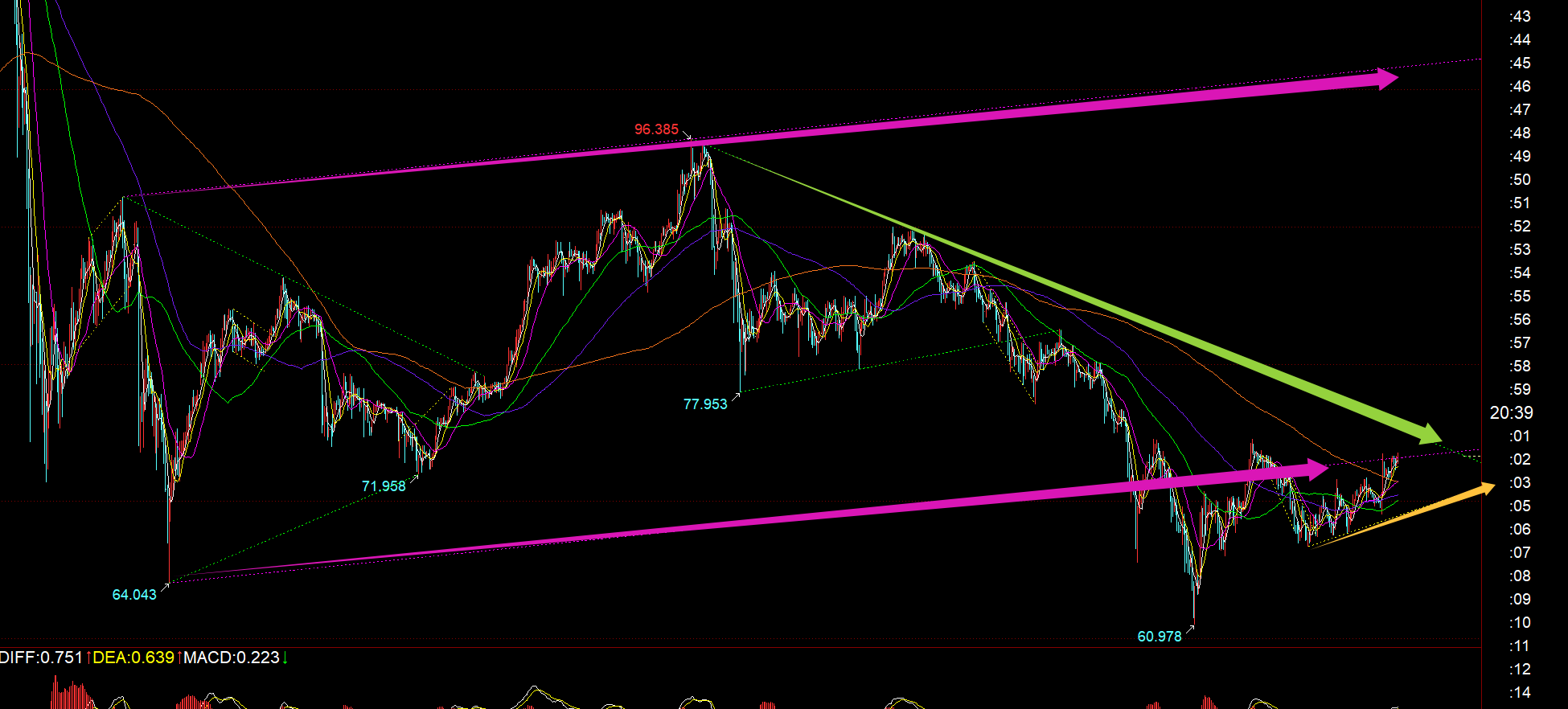 白银方面:从图中各通道可以看出,黄色底部趋势线是短期的关键,只要守住,低点逐步上移,最终会向上发展;而目前测试的是紫色通道下轨反压点,这里测试了多次,能有效站稳它,就可以测试绿色趋势阻力线,它再突破站上,就会打开上行很大空间了; 所以今晚留意73.1阻力,顶底71.7支撑,守住支撑,则向上站稳73.1,可以看74.5-75(绿色趋势阻力线),若失守71.7-71.5向下,那么又是反复的来回震荡,届时留意黄色趋势线支撑;