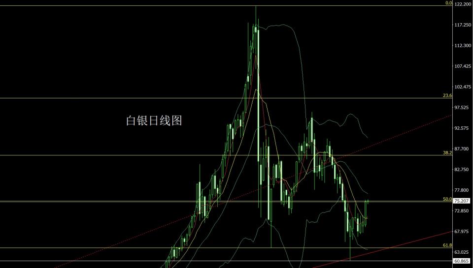 白银市场昨日低开在68.481的位置后行情先回落,日线最低给到了68.974的位置后行情强势拉升,日线最高触及到了75.364的位置后整理,日线最终收线在了75.101的位置后,日线以一根下影线很长的大阳线收线,而这样的形态收尾后,今日的行情回踩延续多,点位上,今日73.2多止损72.9,目标看74和75就和75.5和76和77和77.6.