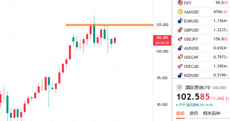 原油的话,虽然美伊战火有停歇的预期,但是胡塞武装还有以色列目前依旧打的很激烈,霍尔木兹海峡没能正式畅通,那么对原油的支撑和炒作就不会停,所以导致原油目前在高位走反复,上个交易日从106一路回落到100附近之后再度反复到了105一线,而且是多次测试,目前没能继续上行,阶段性看这个位置就分水岭压力位,操作上线依靠这个位置先看调整,然后关注美伊后续实际谈判落地情况,下方关注100关口短期支撑