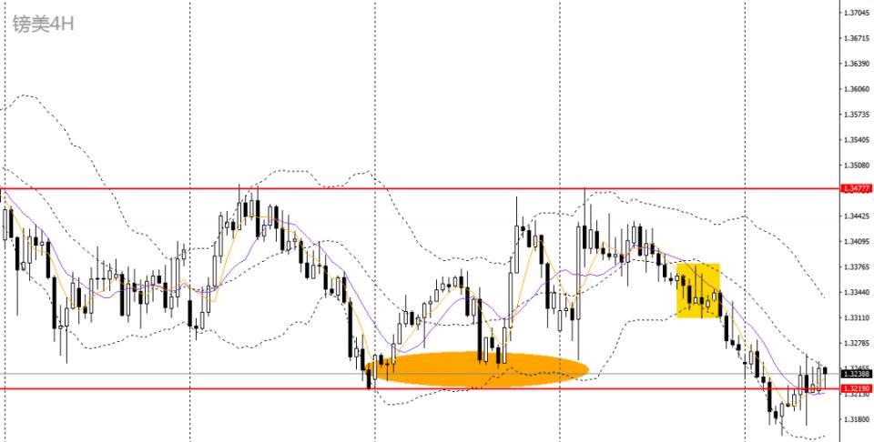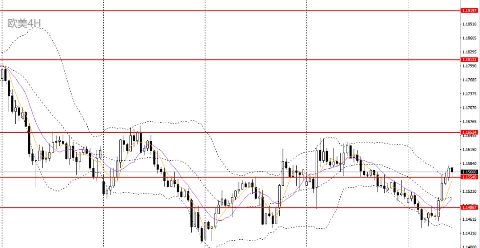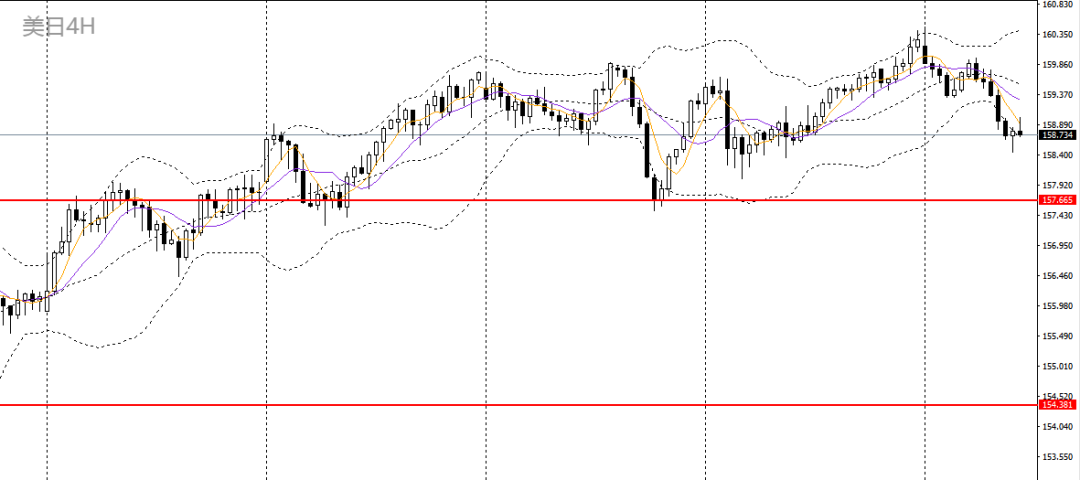 美日连续2日收跌,下破日线布林下轨,4小时呈头肩顶,159.30下方可延续高空思路,短线有望回踩158-158.20。