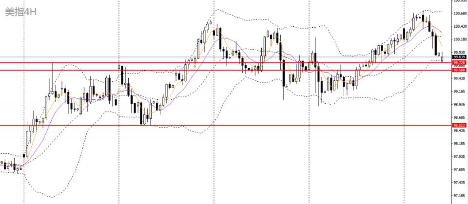 美元指数收看跌吞没阴柱,回踩10日均线,4小时失守100关口,重回此前震荡区间,短线预计将维持高位震荡格局。